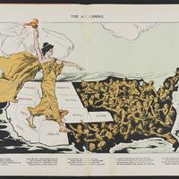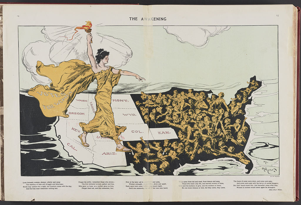 - Illustration shows a torch-bearing female labeled "Votes for Women", symbolizing the awakening of the nation's women to the desire for suffrage, striding across the western states, where women already had the right to vote, toward the east where women are reaching out to her. Printed below the cartoon is a poem by Alice Duer Miller.